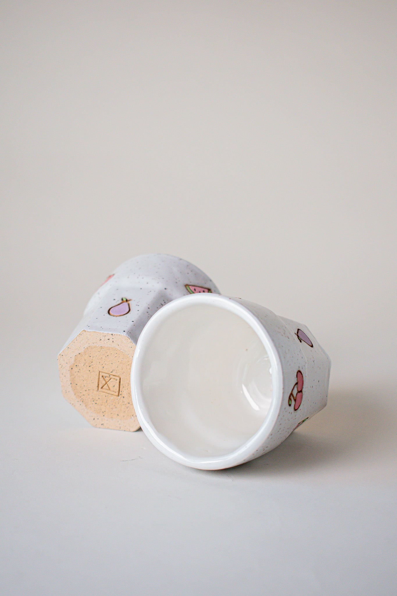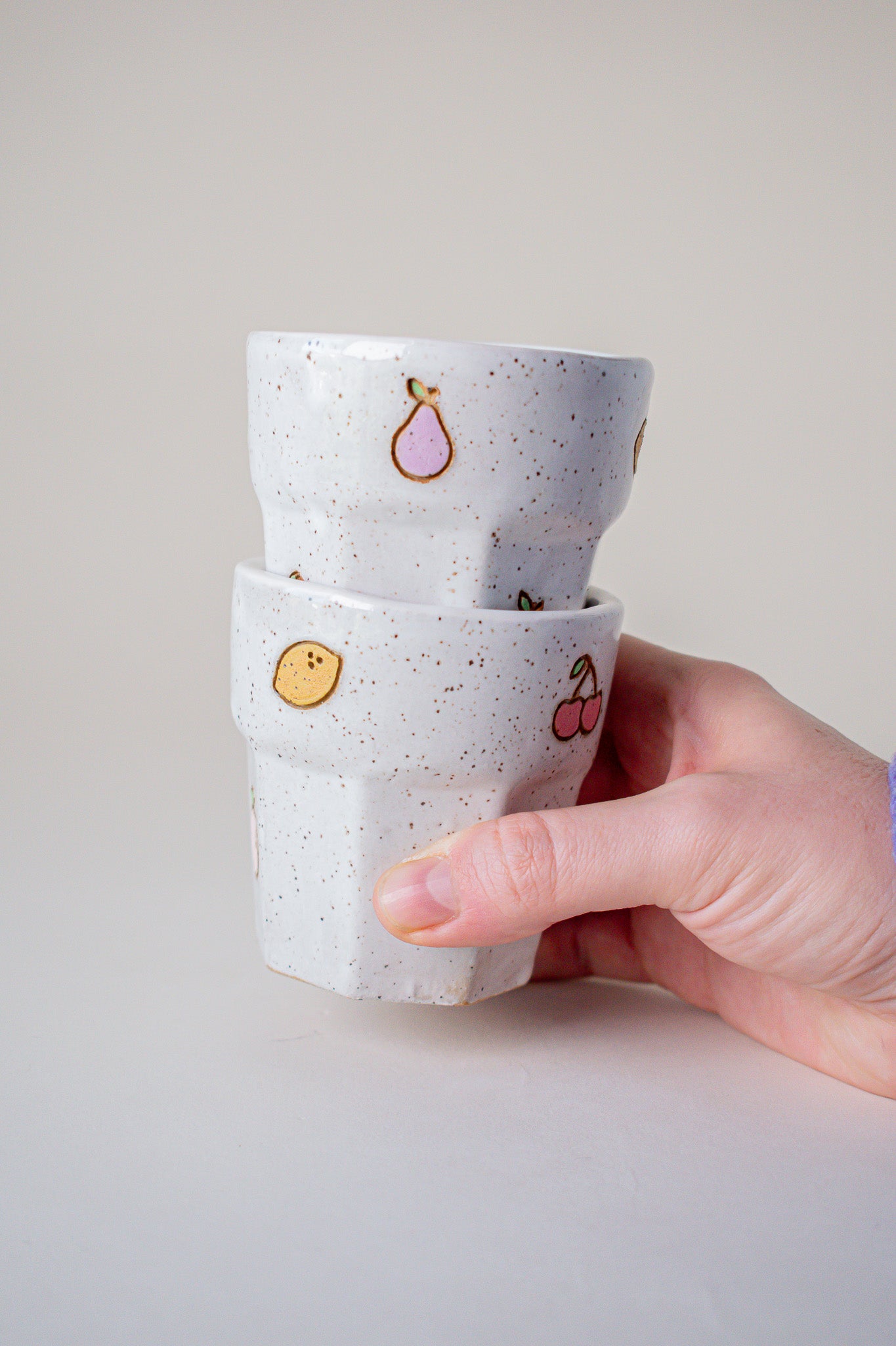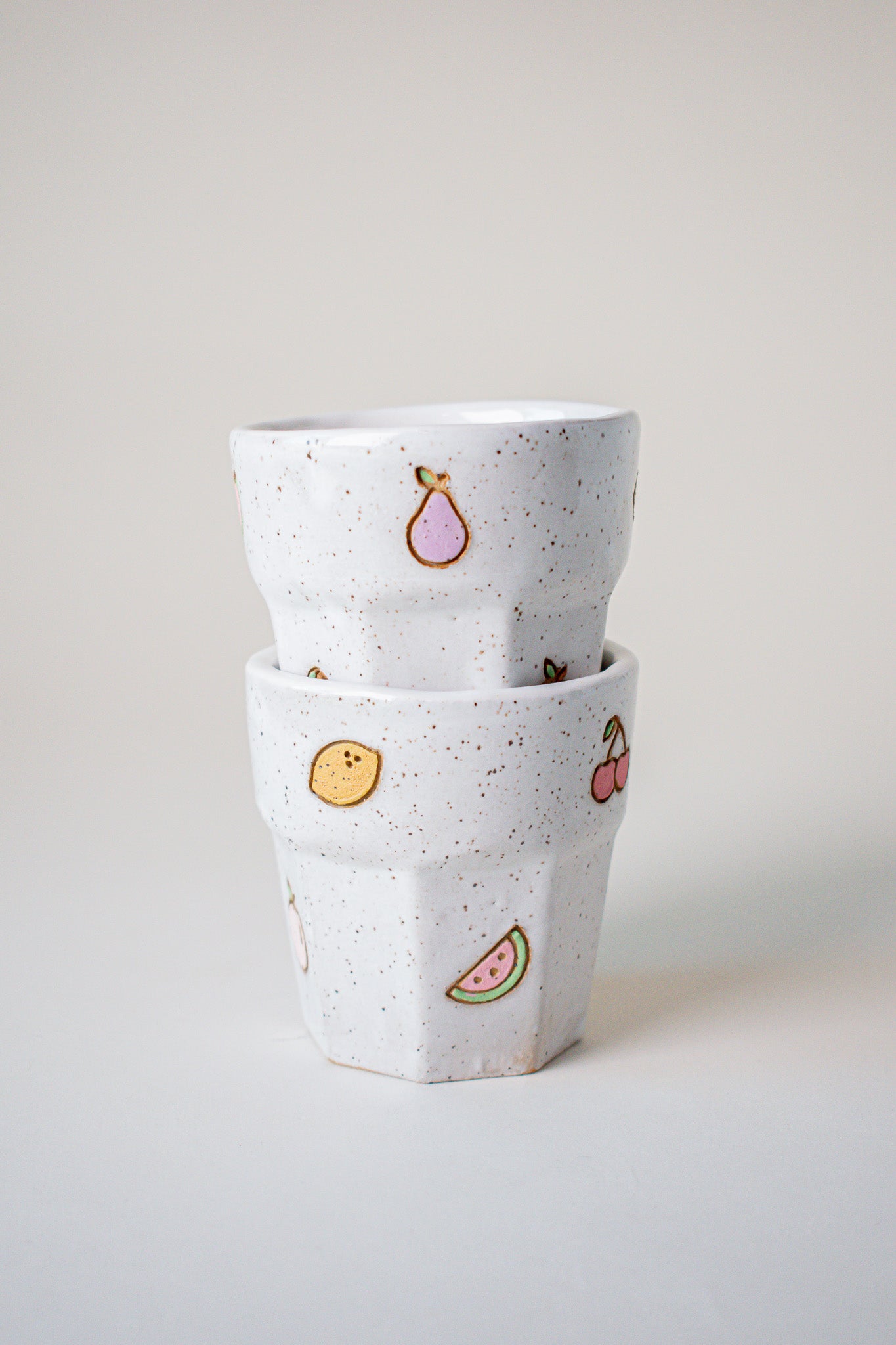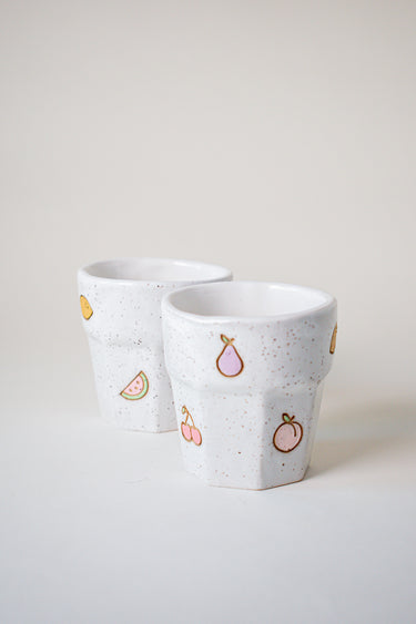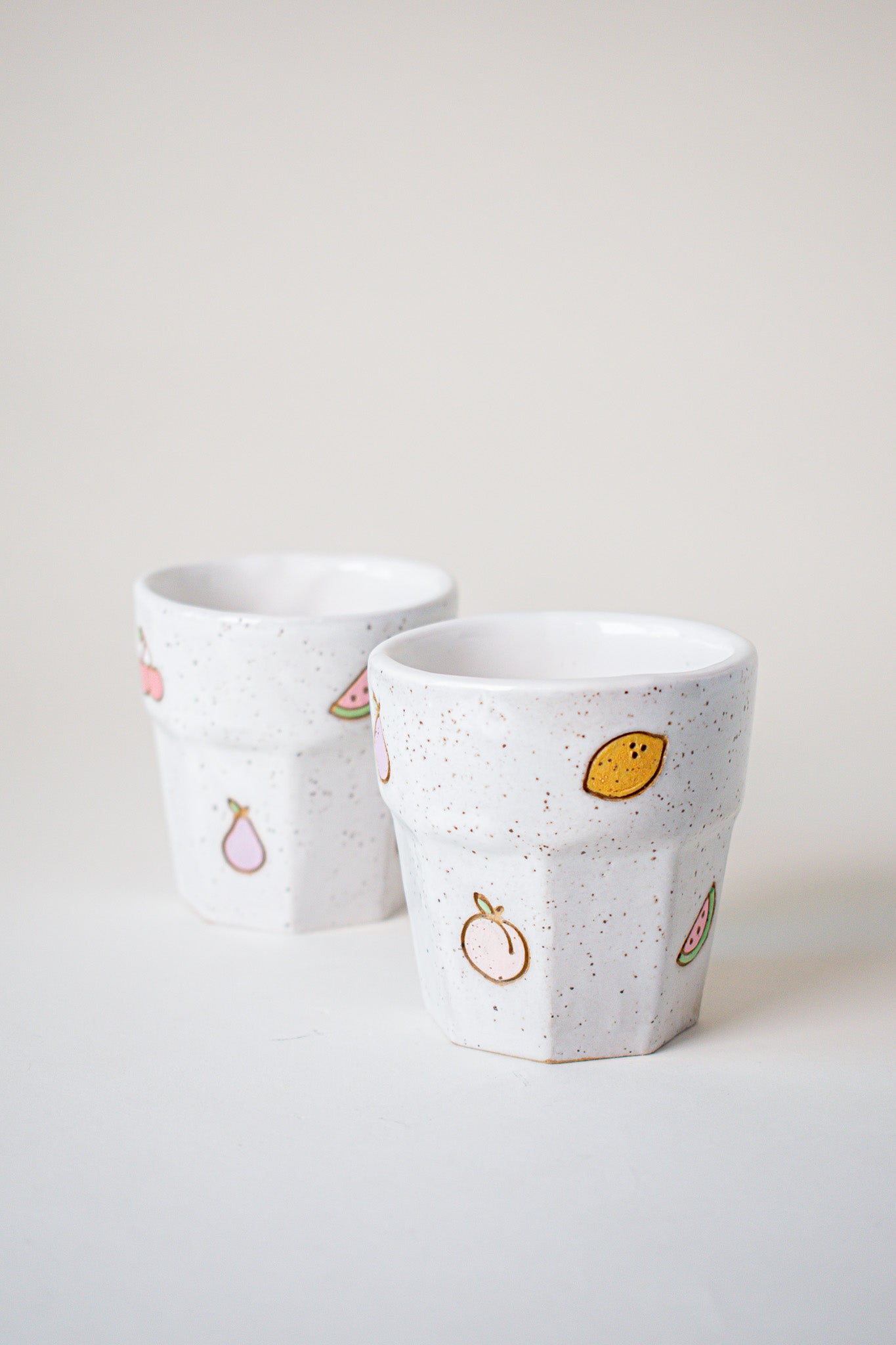 These ceramic whiskey/espresso glasses, adorned with the playful imagery of pears, watermelons, peaches, lemons, and cherries, whisk you away to a world where summer never ends and the sweetness of fruit is always in the air. Each sip from these charming cups is like a stroll through sun-kissed orchards and vibrant fruit markets, evoking memories of lazy afternoons and impromptu picnics under azure skies. Perfect for enjoying a robust espresso or a smooth whiskey, these glasses blend the joy of summer fruits with the warmth of your favorite drink, making every moment a celebration of flavor and nostalgia.